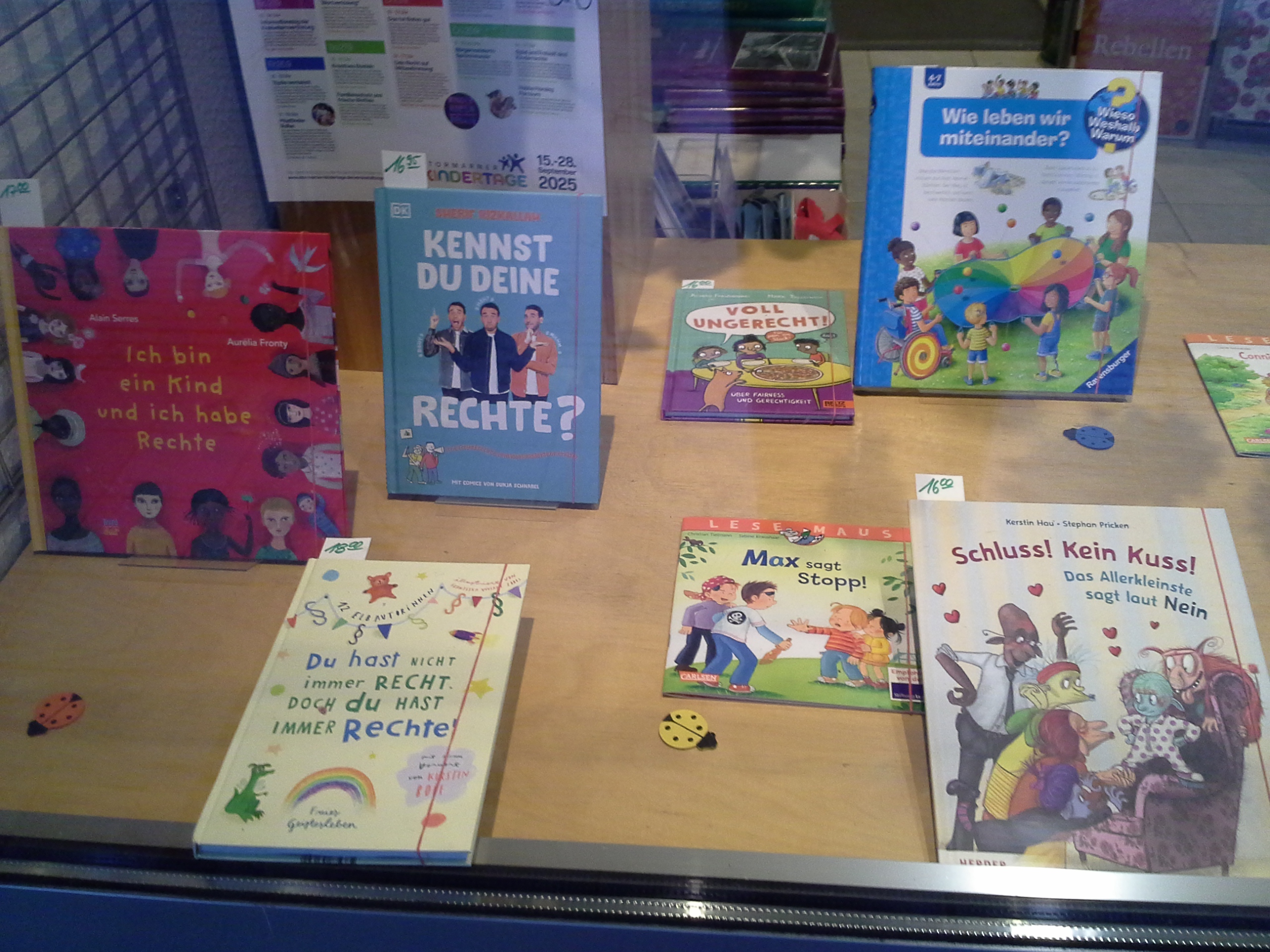 Und der Kinderrechte-Pavillon steht in diesem Jahr auf der Kircheninsel in Bargteheide. Anlass für mich ein paar passende Bücher ins Schaufenster zu dekorieren.